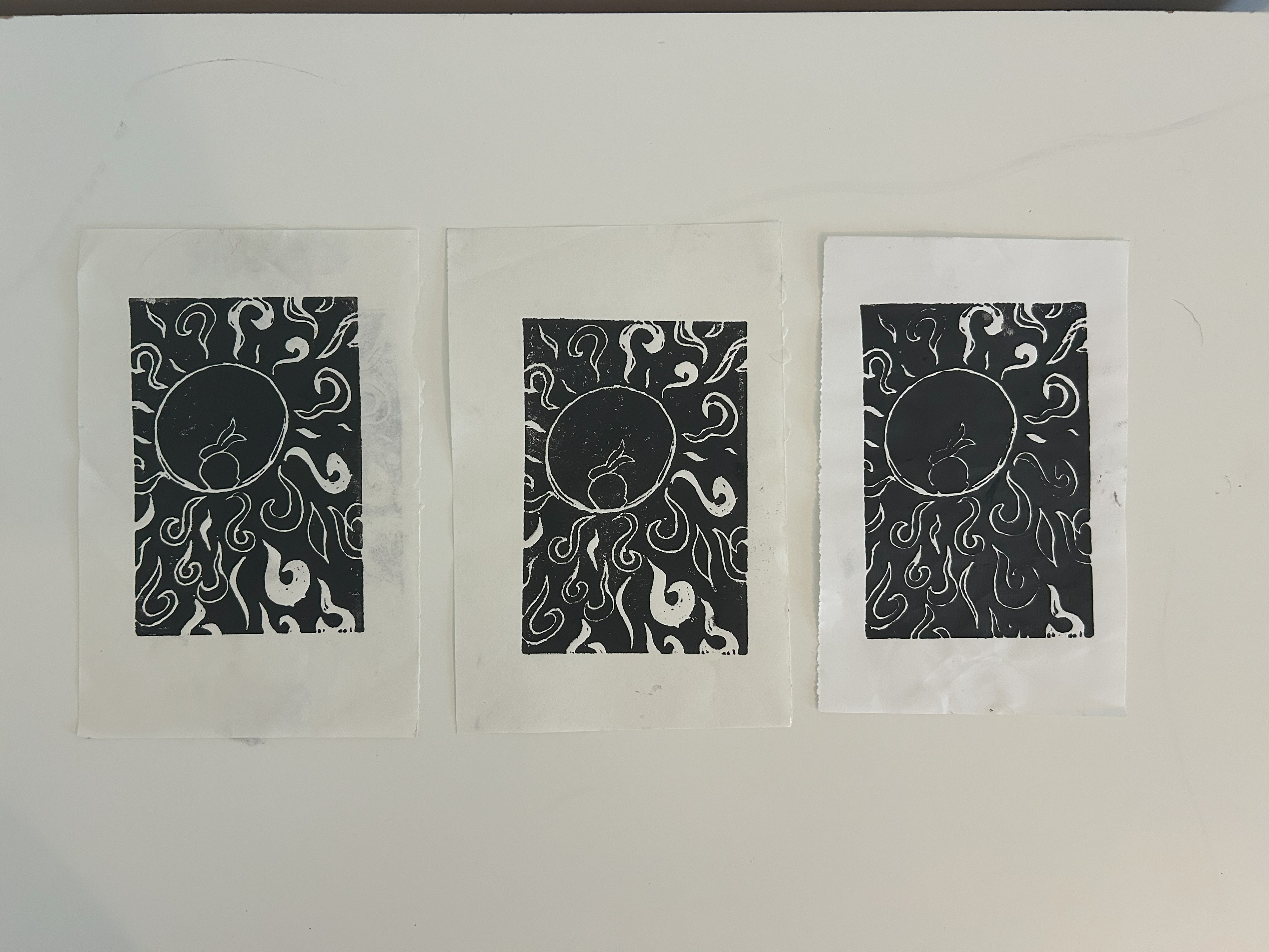 Carved linoleum stamps, prints.